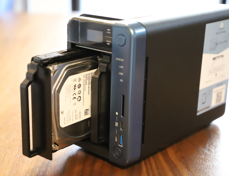 只要先將NAS左側的開關往下移動,就能順利將面板取下;接著請分別將兩個Bay slot給取下