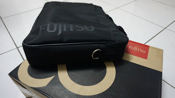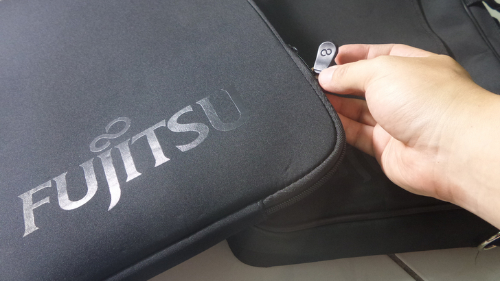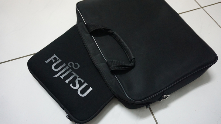 【▼】包裝箱內還有個非常精美的筆電包,表面一樣印有 Fujitsu,大小約略可裝下15吋的筆電。