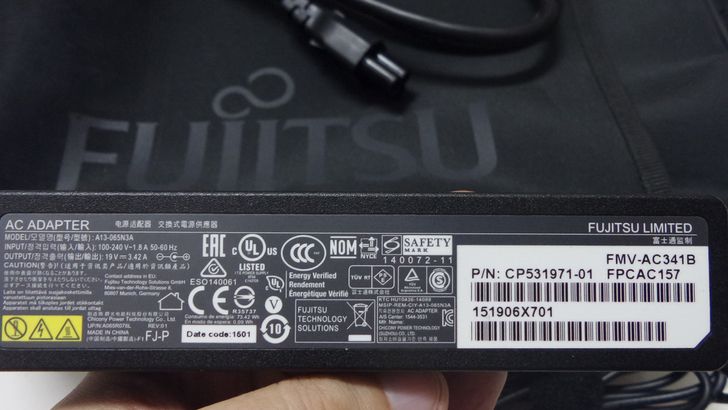 【▼】在外層包包的內夾袋中有一條三孔電源線以及變壓器,這個變壓器通過好多電源安規的認證,常見的EAC、ESO、UL、CCC、NOM等統統都有,是小編看過最齊全的認證標準,變壓器型號是A13-065N3A,額定輸入為100-240VAC@1.8A~50/60Hz,額定輸出為19VDC@3.42A。