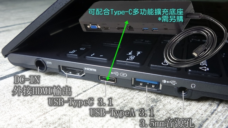 【▼】Fujitsu LIFEBOOK U937機身左側依左至右為 DC-IN、外接螢幕的HDMI輸出埠、USB3.1 Type-C、USB3.1 Type-A 與 耳麥 Combo Jack,其中 USB3.1 Type-C還可與選購的多功能底座來擴充機身沒有的VGA與DP介面。而在左側的 USB3.1 Type-A 可以設定關機時充電,對於臨時電力不夠的手機或行動裝置來說,真的很方便。