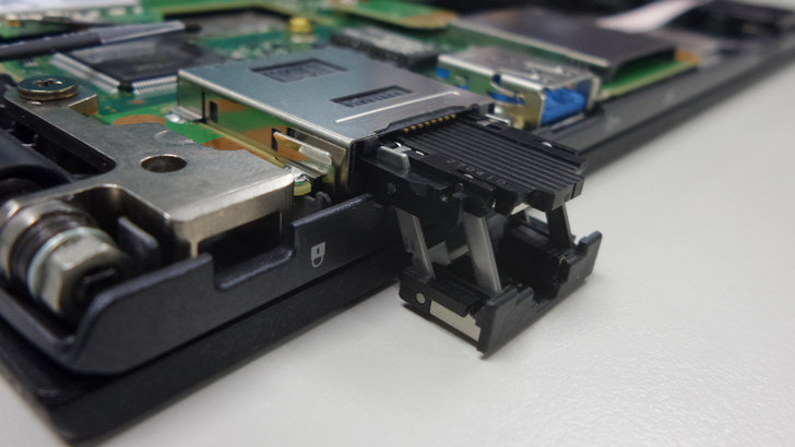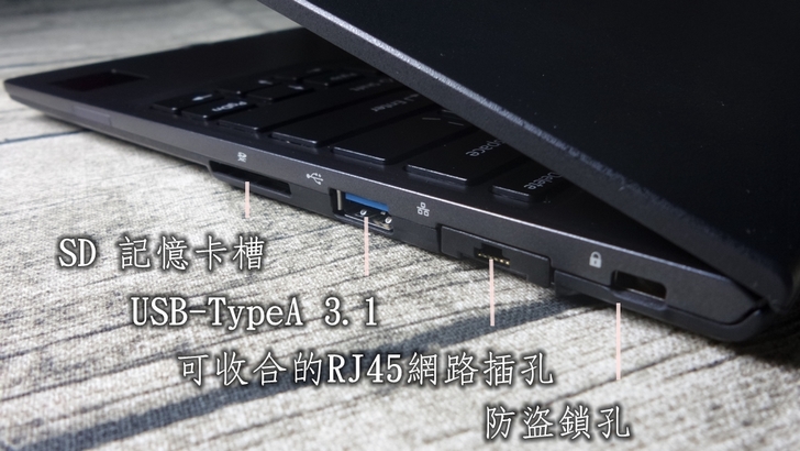 【▼】Fujitsu LIFEBOOK U937機身右側依左至右為 SD記憶卡槽、USB 3.1 Type-A連接埠、可收合的 RJ45 網路插孔與防盜鎖孔,其中記憶卡槽,針對SD記憶卡最大支援到2GB、SDHC記憶卡最大支援到32GB,而SDXC記憶卡最大則支援到128GB。