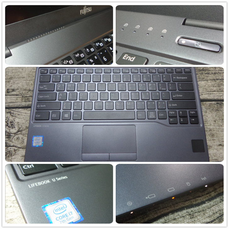【▼】掀起Fujitsu LIFEBOOK U937的螢幕,映入眼簾的就是孤島式的84鍵設計,採用一般筆電常見的 Full-Sized 鍵盤設計。左上是機身透氣孔,右上有鍵盤的相關指示燈號,左下標註著LIFEBOOK U系列與貼有Intel Core i7的正版貼紙,右下則是系統的狀態燈號。