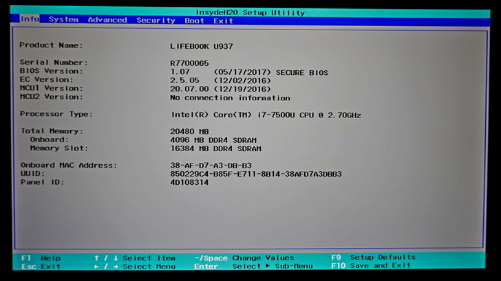 【▼】小編習慣進Windows前先進BIOS看一下,這邊進入BIOS的方式一樣也是開機時按下 "F2" 鍵,Fujitsu LIFEBOOK U937採用系微 InsydeH2O® UEFI BIOS,快速開機技術是其特色,數秒內即可完成系統開機。BIOS內部有資訊、系統、進階設定、安全性、開機順序與儲存離開等六個頁面。從資訊頁面可以知道處理器是採用 Intel Core i7-7500U@2.7GHz,RAM總共有20GB。