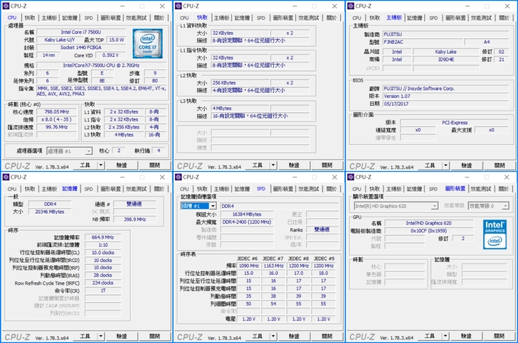 【▼】以CPU-Z查看資訊,2C4H的i7 7500U是Intel第七代處理器,採Kaby Lake微架構,是14奈米的製程,預設時脈為2.7GHz,最高 3.50 GHz,並內建有4MB的L3快取記憶體,TDP也僅有15W,是非常適合用在筆電上的處理器。主機板是使用Fujitsu自家的FJNB2AC,記憶體是16GB DDR4@2133MHz+4GB(onboard),至於顯示並沒有獨立顯卡,是採用Intel內建的HD Graphic 620,兼容4K影音媒體、360度視頻、VR以及AR應用。