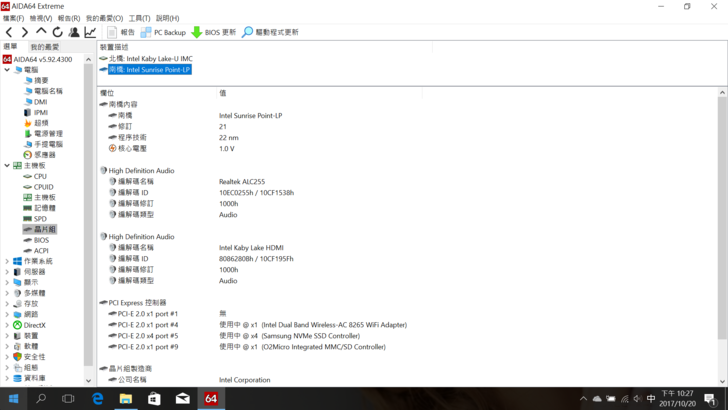 【▼】以AIDA64查看南橋晶片為Intel Sunrise Ponit-LP,採用 DMI Gen 3,最大擁有 20 通道的 PCIe 3.0,負責音頻的控制器為Realtek ALC255,型號 ALC255 這款 HD Audio Codec,類比輸出、入僅支援 2 聲道,如果需要環繞多聲道輸出,就得改由 HDMI 介面來輸出數位訊號。