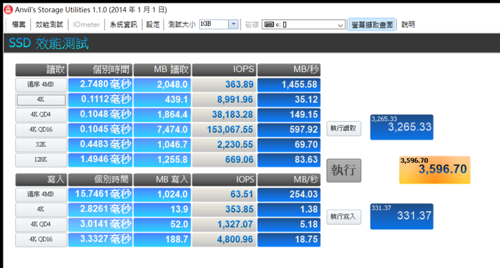 【▼】以Anvil's Storage Utilities 1GB的檔案大小作測試,讀取3465分,寫入331分,總分為3596分。