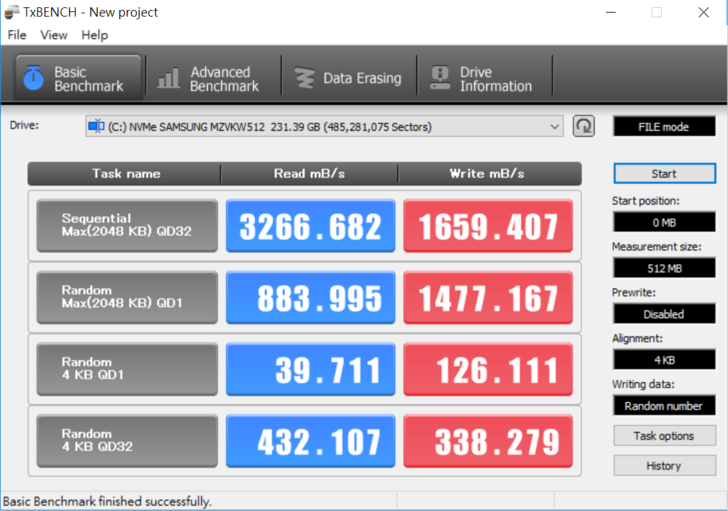 【▼】以TxBench進行測試,循序讀取與前面測試軟體差不多,讀取約在3266MB/s,寫入為1659MB/s;倒是隨機讀取能有883MB/s、寫入1477MB/s算是相當亮眼。