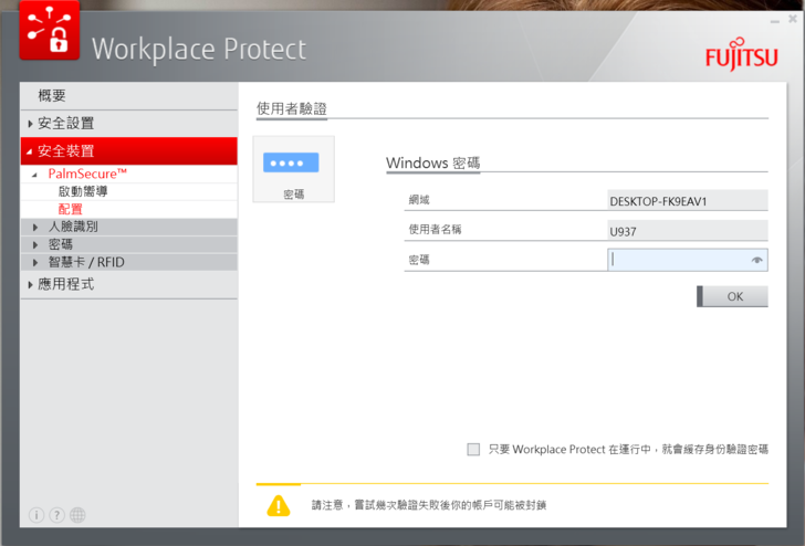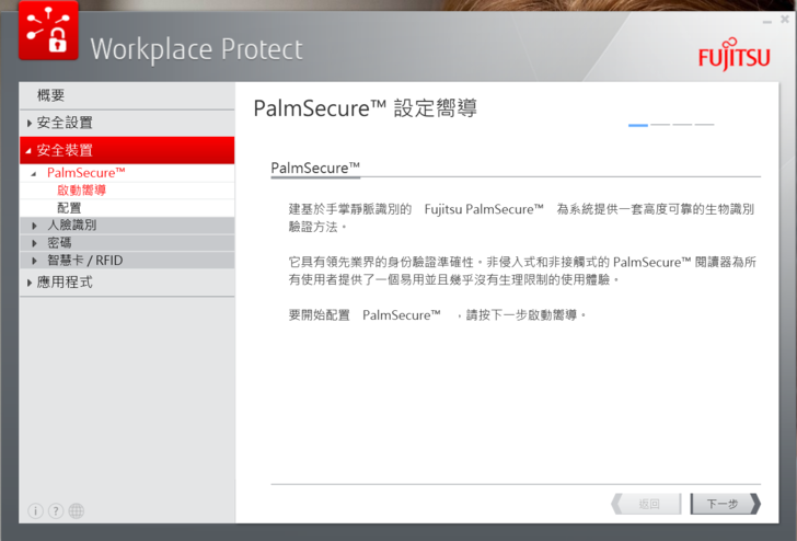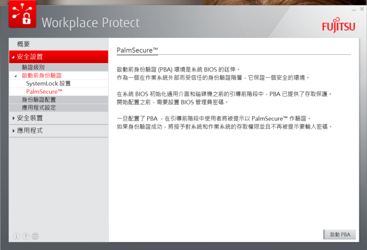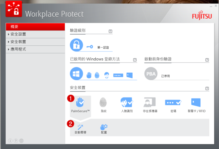 【▼】不過要啟動掌靜脈識別功能的話,就必須先執行 Workplace Protect 這個應用程式,執行後可看到概要的部分,藍色部分代表是已經啟動的功能,而灰色是尚未啟動或是停用的功能。這邊我們先點擊 PalmSecure™,再點選啟動響導。