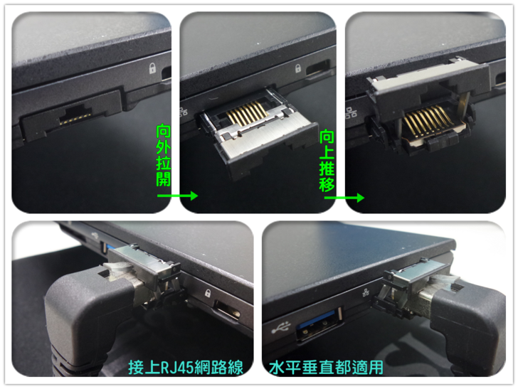 【▼】這個可收合的 RJ45 網路插孔可不是為了酷炫,而是有耐衝擊的能力,能將水平或垂直的網路線緊密接合不脫落。