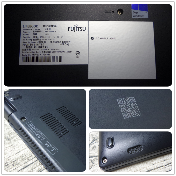 【▼】再來看看Fujitsu LIFEBOOK U937機身底部,也是鎂鋰合金打造,除了貼有Windows10 Pro的正版貼紙與產品相關資訊(產品序號、型號、製造商、製造日期等)外,還印有一個 QR Code可直接連到官網,機殼四個角落有防滑膠墊,偏右上緣處是CPU位置,有配置散熱風扇以及出風孔,讓熱氣能快速排出,Made In Japan,品質就是不一樣!
