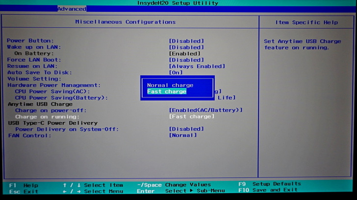 【▼】在進階設定中,比較特別的是的是 Charge on running可以選擇一般充電或是快速充電,這也是Fujitsu LIFEBOOK U937有名的 Anytime USB Charge讓您隨時可充。