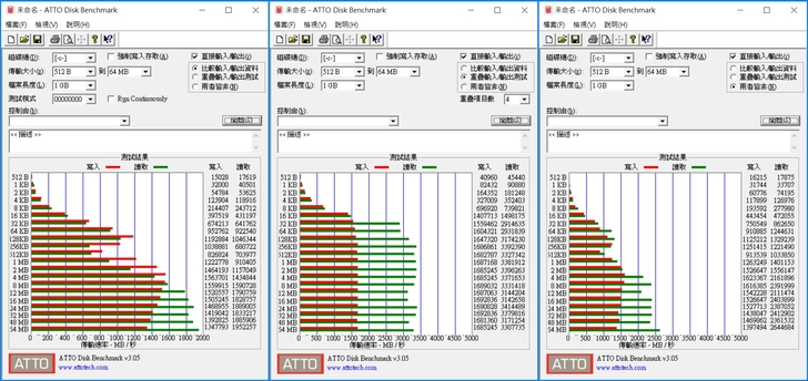 【▼】以ATTO Disk Benchmark作測試,檔案長度1GB,讀取寫入以重疊輸入/輸出測試最為顯著,分別為3400MB/s與1699MB/s,至於比較輸入/輸出資料與兩者皆非的讀寫表現也都有2000MB/s與1500MB/s的表現。