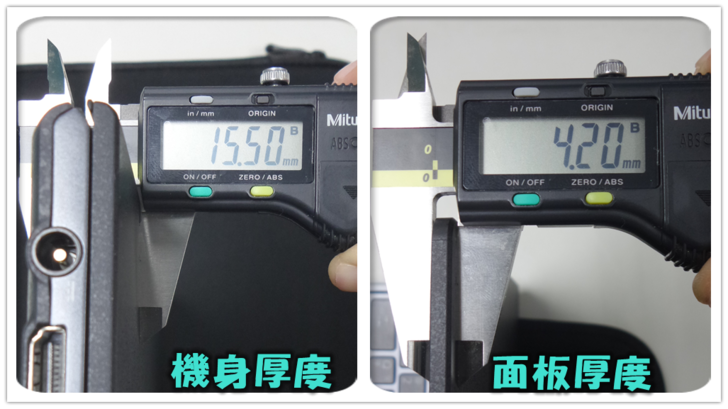 【▼】至於大家最關心的厚度問題,小編特別借了精準的游標卡尺來量量,全機身厚度為15.5mm,而螢幕面板厚度僅占4.2mm,纖薄程度真叫人咋舌。