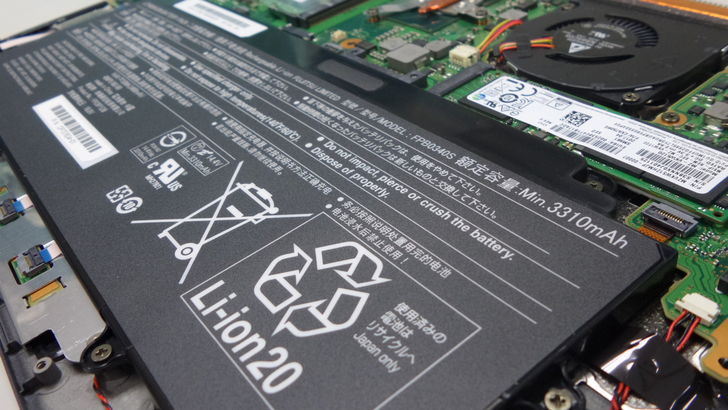 【▼】比起他牌筆電,Fujitsu LIFEBOOK U937只要卸下機殼上的12顆螺絲,就可直接將底蓋拿下來觀看內部情況,未來做擴充或換電池都很方便,小編體驗的這款是4-Cell電池 ,容量有3310mAh,可達15小時的續航力。