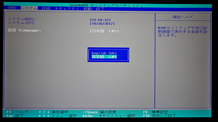 【▼】在Fujitsu LIFEBOOK U937 BIOS 系統頁面中可以調整日期、時間與語言,不過只有英日兩種,並沒有繁體中文顯示。