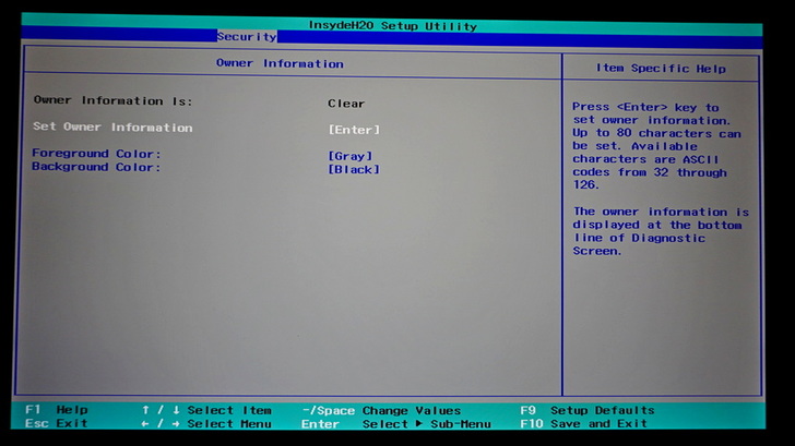 【▼】在Fujitsu LIFEBOOK U937 BIOS 安全性頁面中,可以設定擁有者的資訊,屆時會顯示在Diagnostic Screen底下欄位。