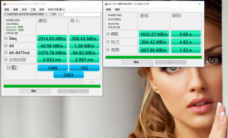 【▼】最後以AS SSD Benchmark進行測試,檔案大小亦為1GB,讀取分數得了1366分,寫入為102分,總分為2063分,對其ISO、程式與遊戲測試的結果來看,單一ISO大檔還是比較佔優勢,速度1620MB/s,花了0.66秒。