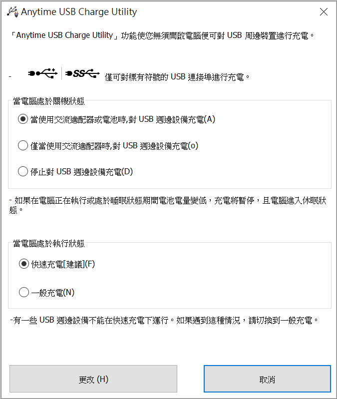 【▼】Fujitsu LIFEBOOK U937在左側的USB插槽,可透過內建 Anytime USB Charge Utility軟體,設定關機情況下,仍可對行動裝置來充電,快速充電經小編測試是5V@1A,而一般充電就只有5V@0.5A,算是在外可應急用。
