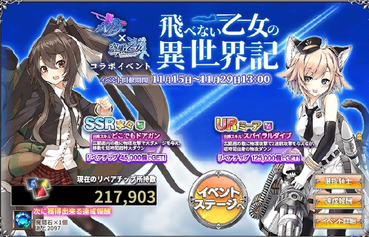 現在跟空戰乙女出合作活動,只要用每天一次的11連抽活動抽個兩天湊幾隻空戰角在隊伍裡面,馬上就能把活動獎勵通通拿到手,像這樣。