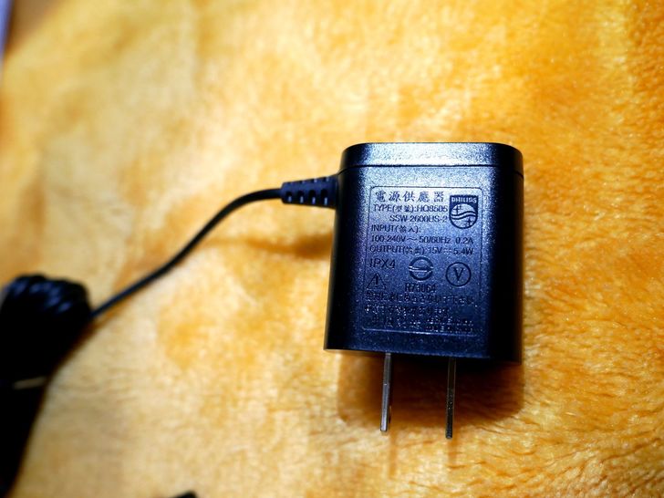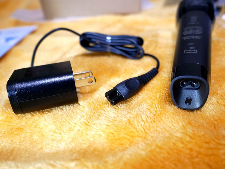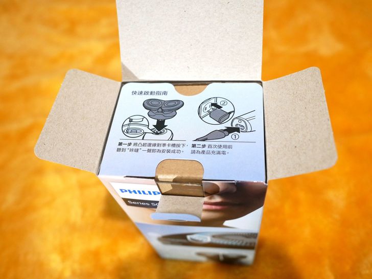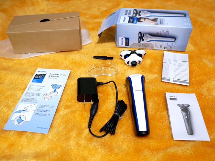 開箱內容有刮鬍刀頭、刮鬍刀柄、保護蓋、清潔刷、充電器等,配件簡單一目了然。