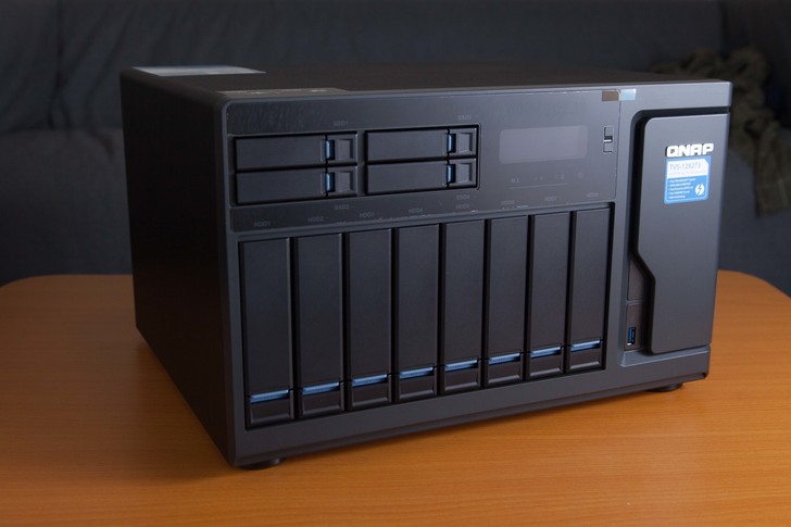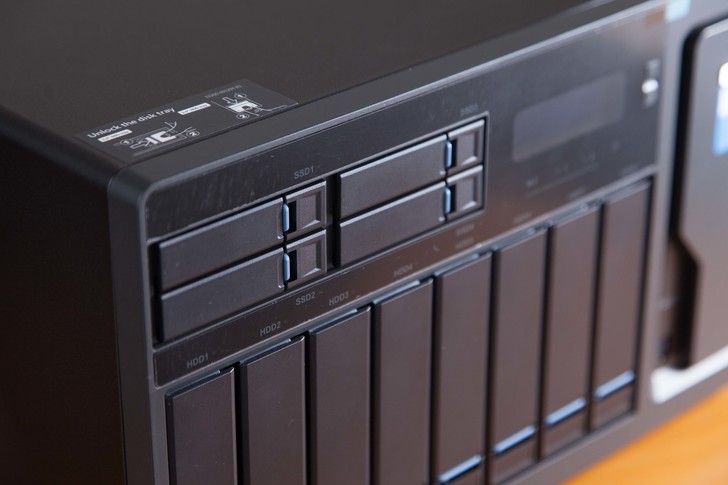 TVS-1282T3硬碟曹主要劃分為8xHDD硬碟槽,4xSSD硬碟槽