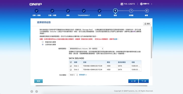 喔對,Qnap的設定介面很貼心會在每一種陣列模式下都會有比較的介紹每一種模式的特性,
