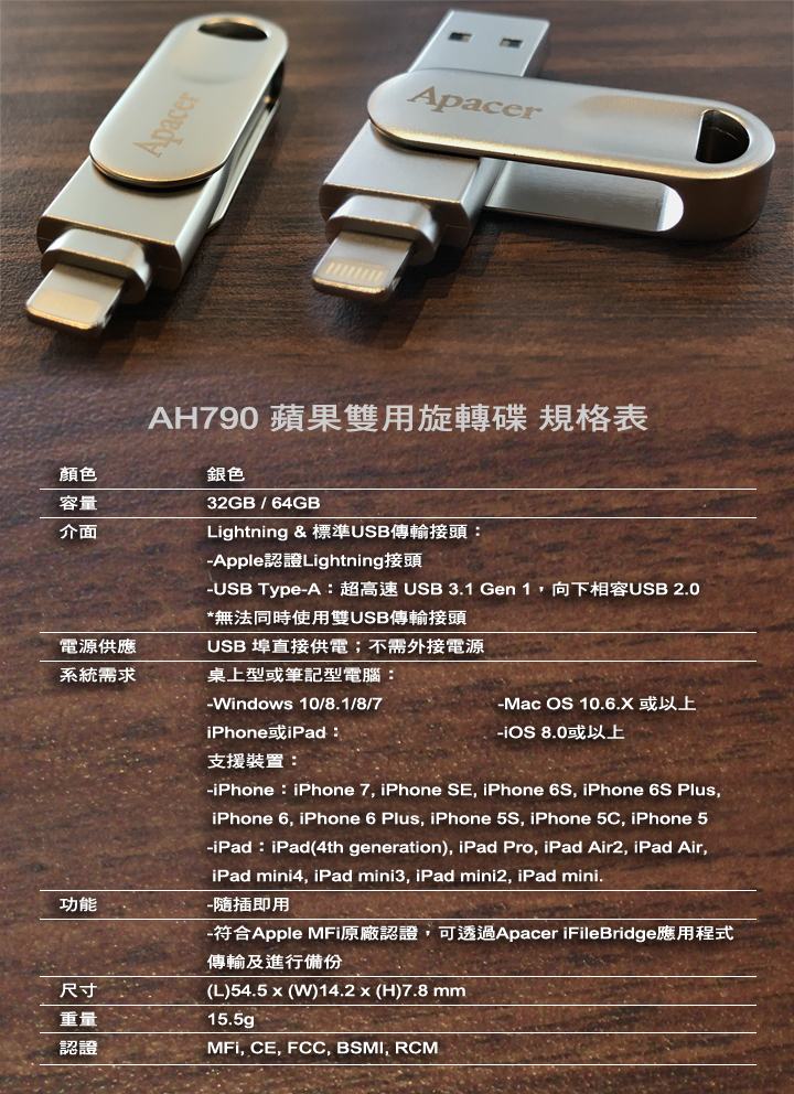 再加上隨身碟的材質有百百種,用來用去,我還是覺得金剛不壞之身的金屬材質,才是最有質感、最耐用的材質,所以今天要來跟各位分享一隻採用質感與強固性兼具的鋅合金材質,輔以多道工藝精心打造而成的AH790 iPhone / iPad雙用旋轉碟,平常能在iOS/Windos裝置、桌機、筆電之間快速傳輸資料外,還可以將檔案、影音、簡報資料隨身帶著走,真是既SMART又方便!