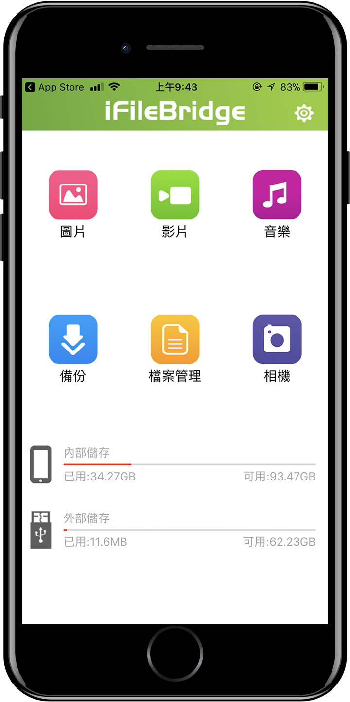▲『 iFileBridge 』操作介面相當直覺,可輕鬆備份圖片/影片/音樂/備份/檔案管理/相機等資料,下方共分為內部儲存區與外部儲存區,內部就是手機的記憶空間,而外部則是AH790使用空間。