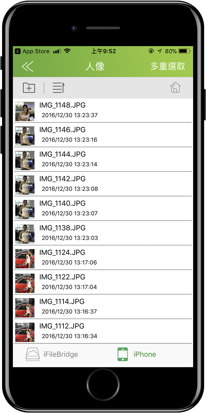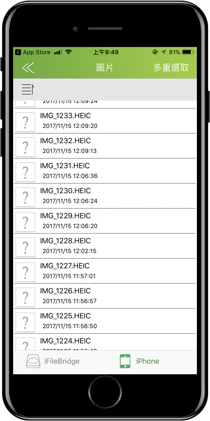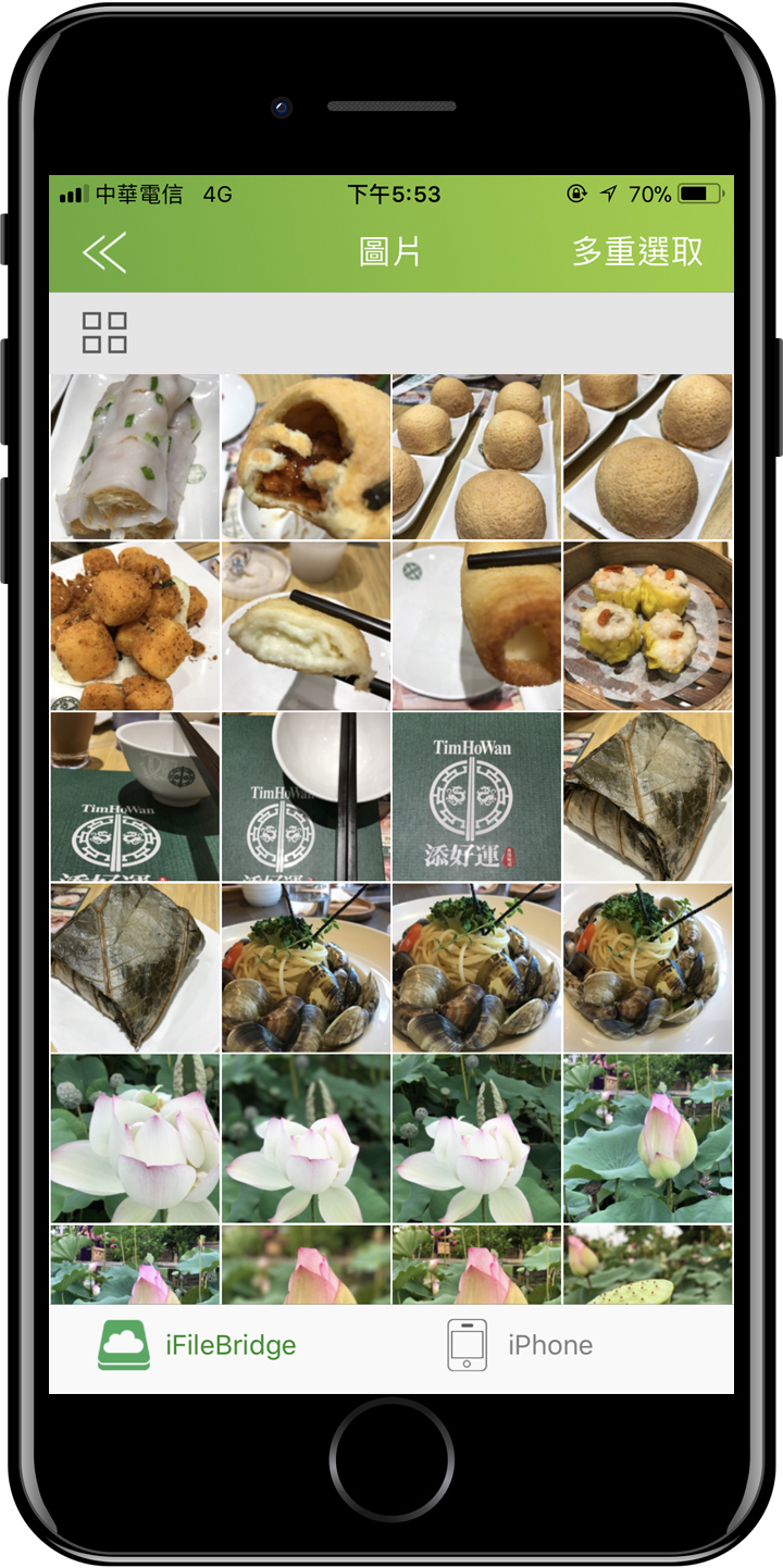 ▲ AH790和其他蘋果專用碟一樣,想要讓AH790能與iPhone資料傳輸,就得仰賴 iFileBridge這驅動軟體App,在iFileBridge的文件管理介面裡,點選右上角的多重選取,再勾選要傳的照片。