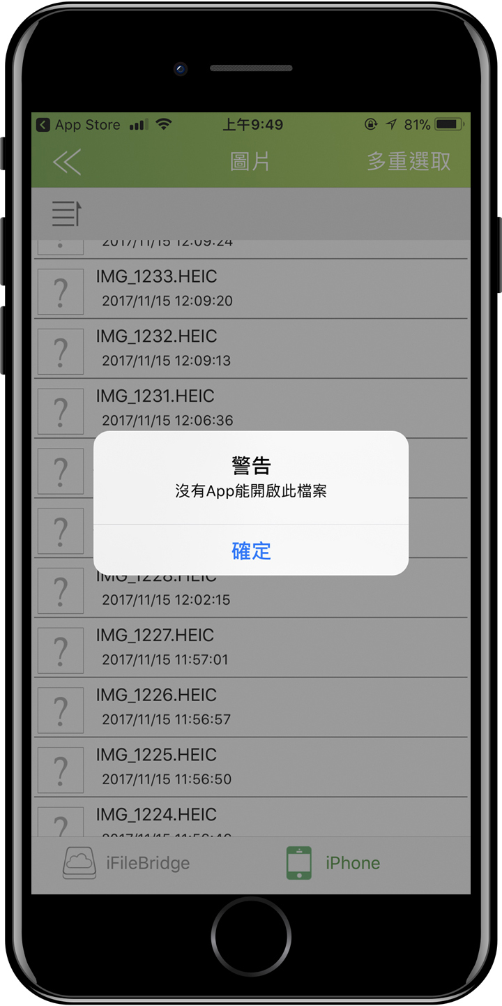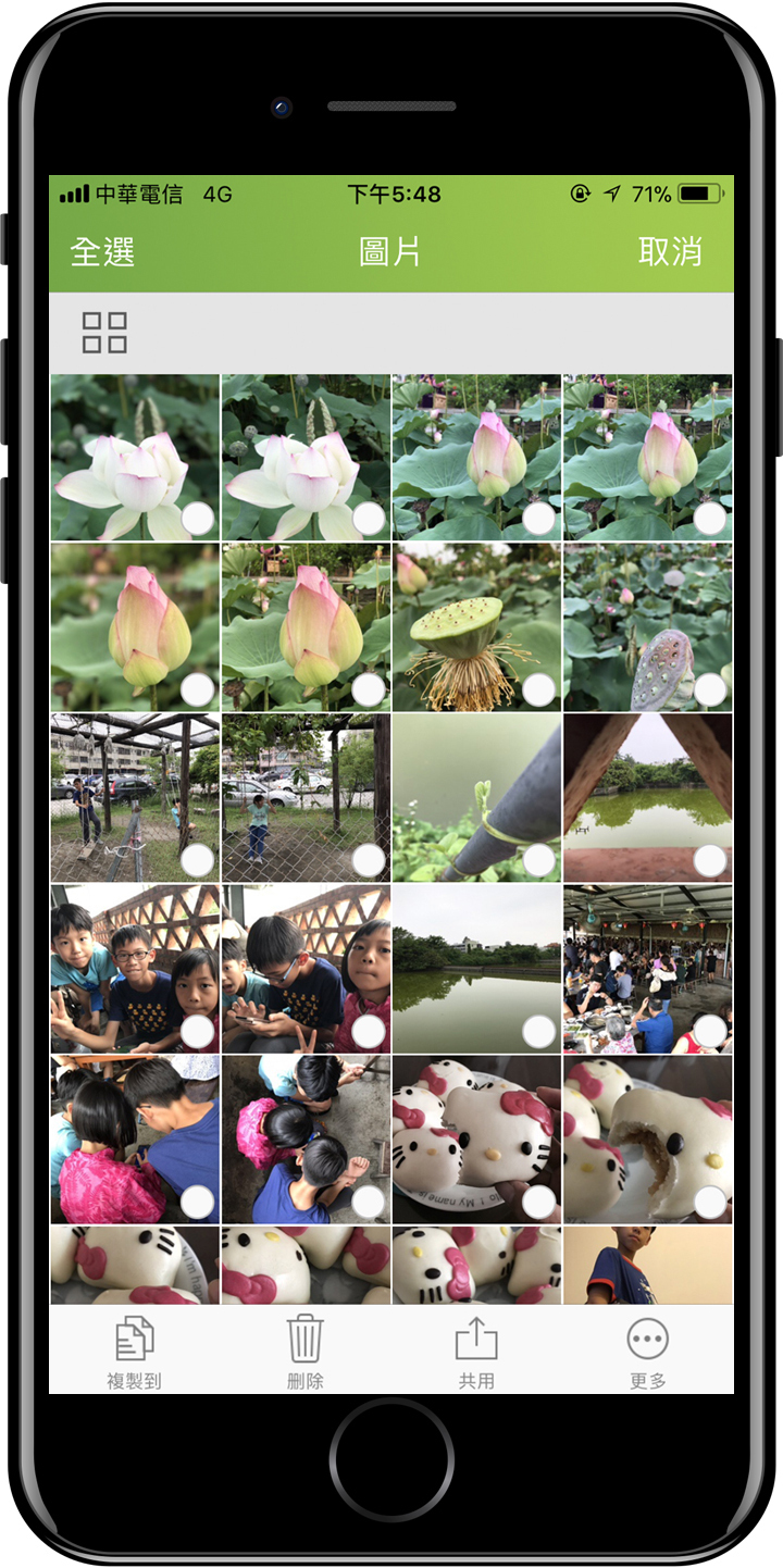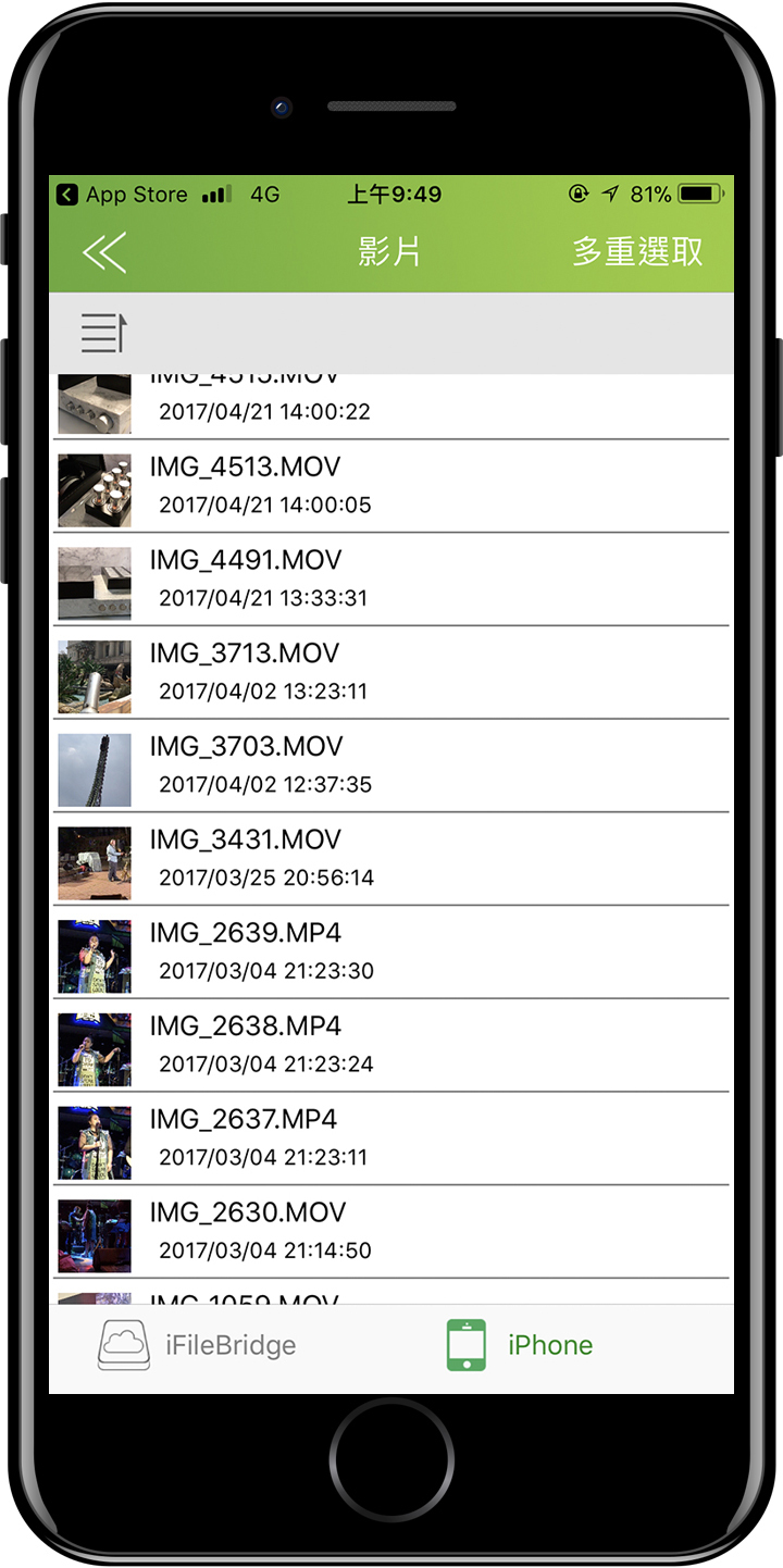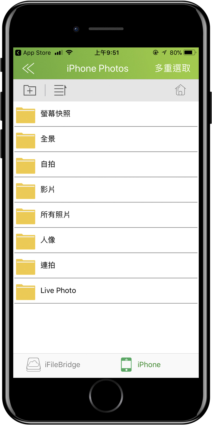 ▲ AH790和其他蘋果專用碟一樣,想要讓AH790能與iPhone資料傳輸,就得仰賴 iFileBridge這驅動軟體App,在iFileBridge的文件管理介面裡,點選右上角的多重選取,再勾選要傳的照片。