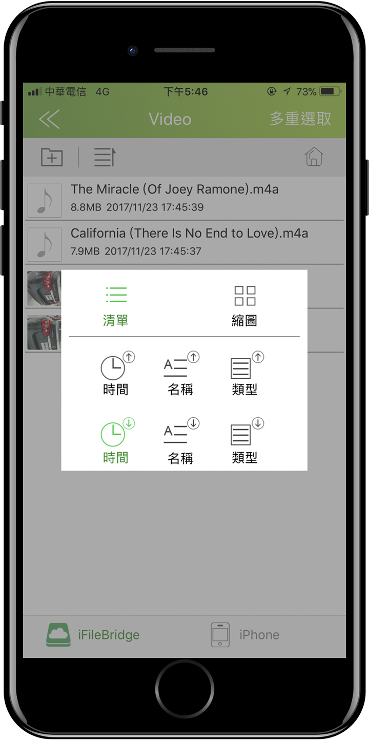 ▲ 檔案管理提供詳細清單與快速縮圖,可以依照時間、名稱、類型來排遞增或遞減的順序。