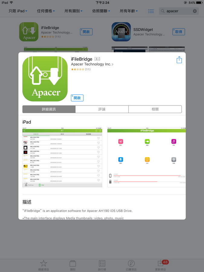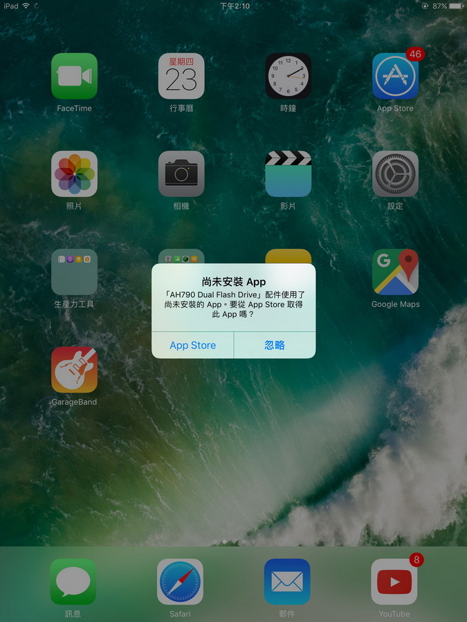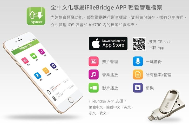 ▼ Apacer AH790 連接 iPad及iPhone 時,會自動偵測有無安裝「iFileBridge」,如果未安裝會有視窗提示至 App Store 安裝。(根本用不到 QR Code 啊!)