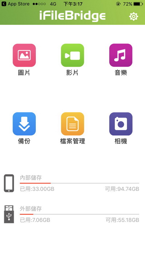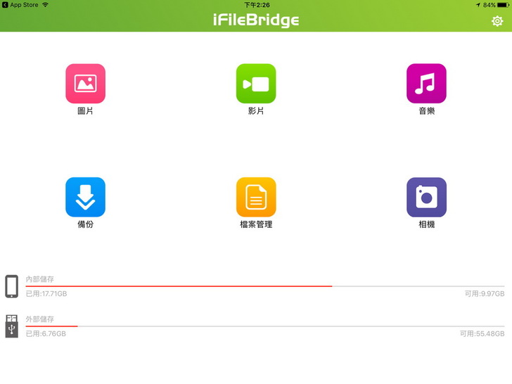 ▼ 「iFileBridge」的直覺式操作介面,圖示分圖片、影片、音樂、備份、檔案管理、相機,下方有分 內部儲存與外部儲存,內部儲存就是平板或手機的儲存空間,外部儲存就是AH790的儲存空間,可用空間及己用空間 也清楚的標示出來。