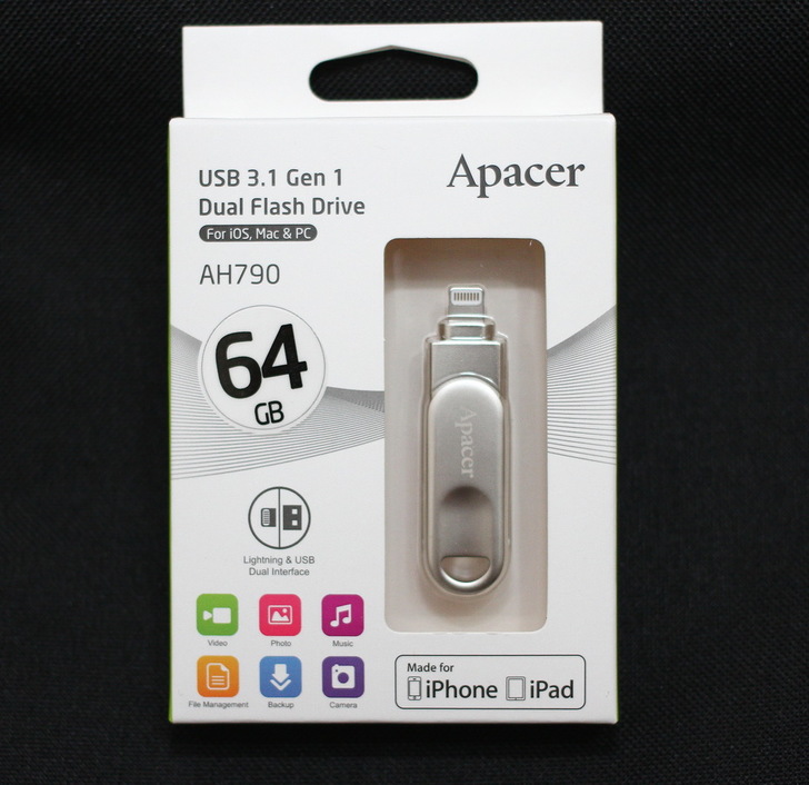 ▼ 外盒包裝正面:宇瞻 AH790 本體、標示容量為 64GB、Lightning與USB 3.1 Gen1雙介面、支援iOS&MAC及PC、可連接於 iPhone&iPad。