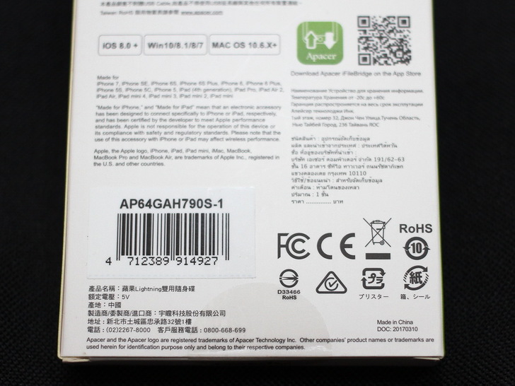 ▼ 外盒包裝背面:標註可使用於 iOS8+、MAC OS 10.6.x+、Win7 以上的系統平台,專屬APP「iFileBridge」的 QR Code,還有一堆安規認證。