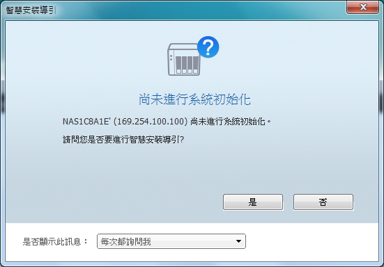 ▲ 因為 NAS 還沒有初始化,所以詢問是否要做初始化動作,同時還有智慧安裝指引,這裡當然點選【是】按鈕