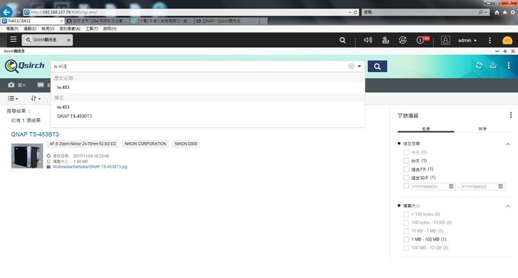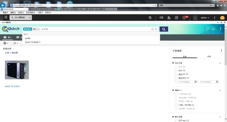 ▲ 這裡本人上傳一照片檔案,檔名為 QNAP TS-453BT3;搜尋時,祗輸入 ts-453 它馬上可自動帶出本人想要的檔案,下拉選單也快速帶出正確的檔案,真的是迅速正確!