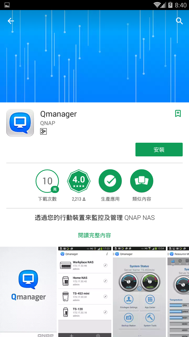 ▲ 安裝 Qmanager App,看到 manager 字眼,就可得知此 App 是用來管理 NAS 用的