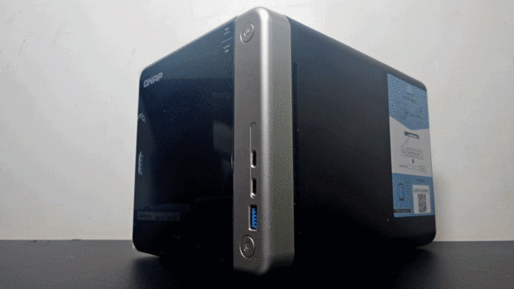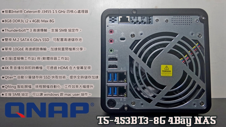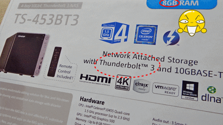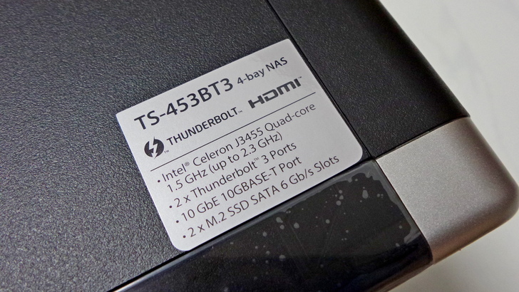 【▼】TS-453BT3機身貼有這台4-Bay NAS的基本硬體規格,包含搭載 Intel Apollo Lake SoC J3455,預設時脈1.5GHz(最高可跑到2.3Ghz),兩組 Thunderbolt™ 3 傳輸埠,雙M.2 SATA SSD插槽與單 10GBASE-T 網路埠,而且內部還預載 2 條 4GB DDR3L 1866 SO-DIMM 共 8GB 記憶體與實體HDMI輸出,能滿足一般家用與中小企業用,