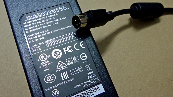 【▼】電源供應器採用翌胜電子出的EA11011H-120,額定輸入為100-240VAC@2.0A,輸出為12VDC@10A,通過的檢驗標準有UL、TDV、VI、FCC、CE、CCC等安規,接頭是四孔防呆的輸入並有磁珠設計,能用來抑制高頻電流所產生的雜訊和噪音,讓傳輸更穩定。
