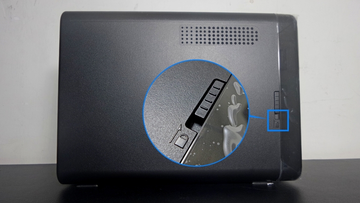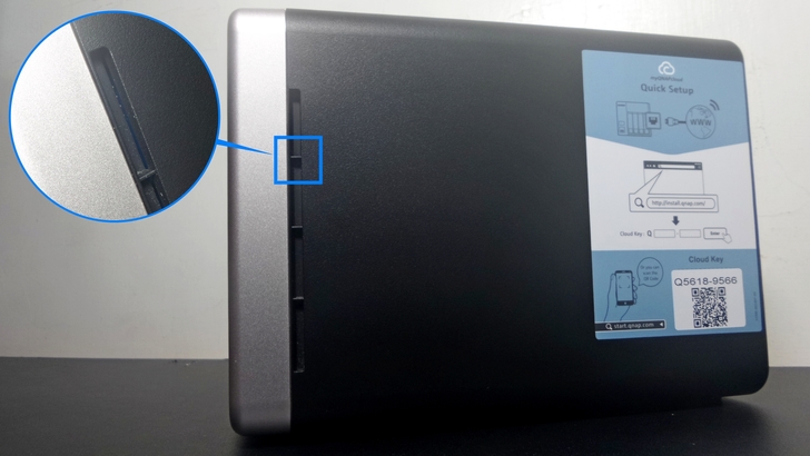 【▼】在TS-453BT3機身右側面貼有快速設定指南,雖說沒有專屬散熱孔,但與機殼抽離處有長條縫隙,多少對散熱也會有所幫助。