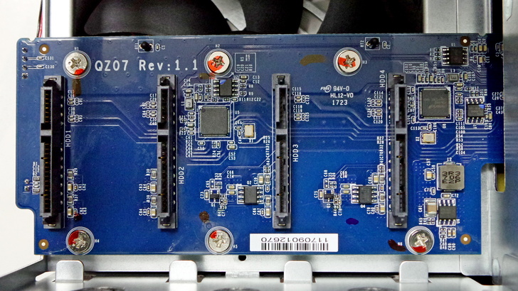 【▼】OK,將其NAS外殼抽離後,可以看見TS-453BT3內部連接硬碟的基板,由左至右的編號分別是HDD1到HDD4,擺放硬碟時,可不要放反了唷~(PS:機身外殼也有標示硬碟順序唷,在移開蓋子之後下方)
