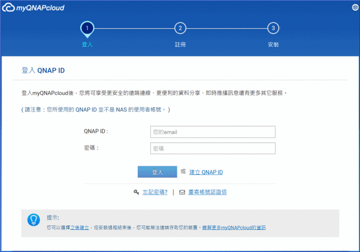 【▼】輸入Cloud Key後,會出現 myQNAPcloud 雲端服務的畫面,其中QNAP ID,是QNAP原廠提供的myQNAPcloud帳號,有此帳號可以享受類似DDNS的 SmartURL(http://qlink.to/裝置名稱)與 CloudLink 服務來連回NAS主機。