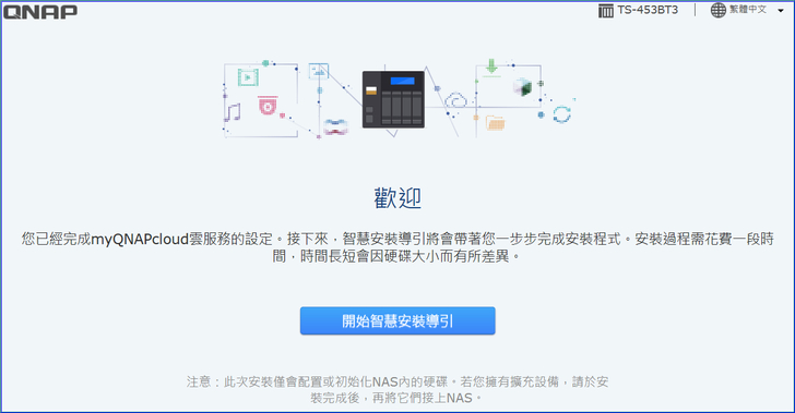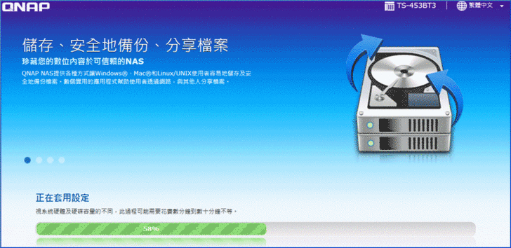 1.硬體安裝:將硬碟放置在硬碟抽取架上,放入TS-453BT3中,並連接上電源與網路。