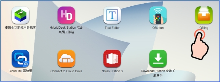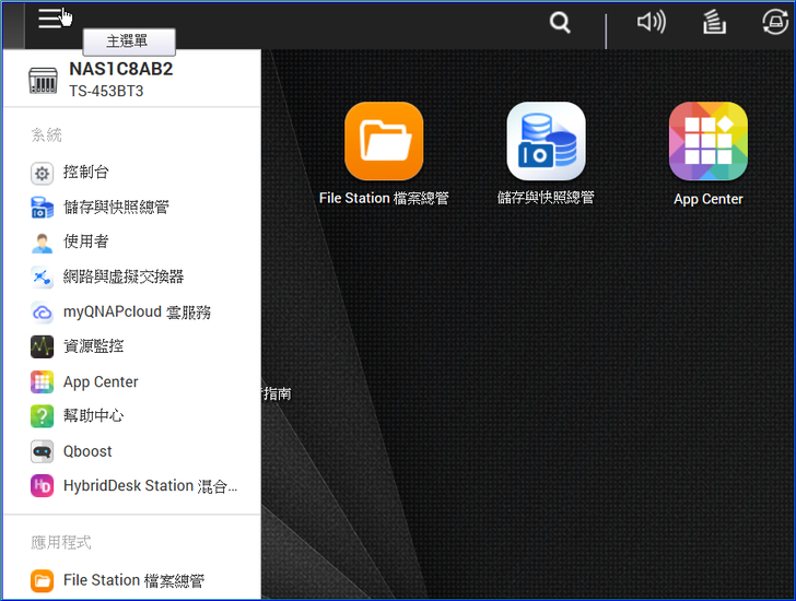 【▼】主選單可已從左上角點擊後下拉,QTS完整的功能設定都可以在此找到。(桌面圖示算是捷徑)