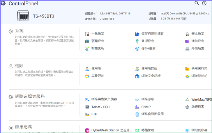 【▼】從主選單可叫出控制台,大致區分成系統設定、權限設定、網路&檔案服務 與 應用服務等。