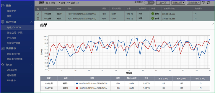 【▼】在還沒分割HGST硬碟時,可以透過儲存與快照總管中的效能測試來看HGST的效能如何?連續讀取效能約在每秒230MB,平均隨機IOPS讀取效能也有171。
