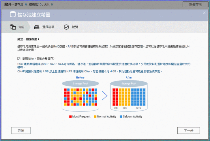 【▼】QNAP Qtier™ 技術實現自動分層儲存可辨別資料存取頻率,自動將頻繁存取的「熱」資料移動到效能較高的磁碟階層,而將較少存取的「冷」資料移動到成本低、大容量的磁碟階層;簡單來說 Qtier 跟 SSD Cache 最大分別就是Qtier可以把SSD當成儲存空間。
