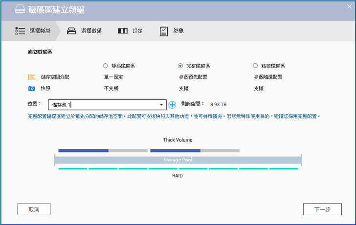 這裡小編以[多重完整配置磁碟區]為例,選擇儲存池後點擊[下一步]。
