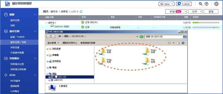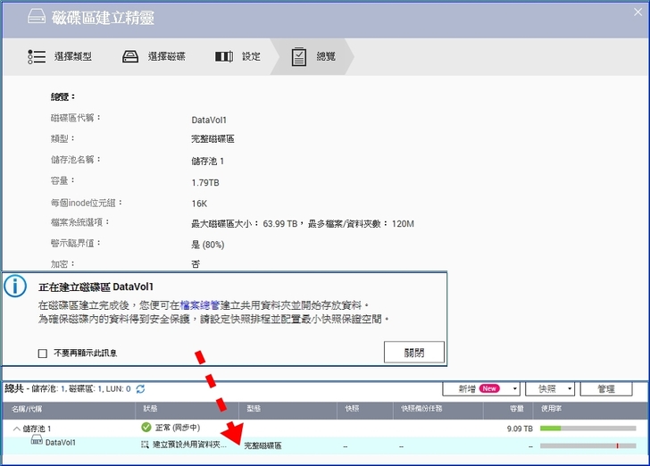 【▼】磁碟建立完成後就可以在公用資料夾中存放資料,此外為確保資料安全,建議設定快照排程並配置最小快照保證空間。